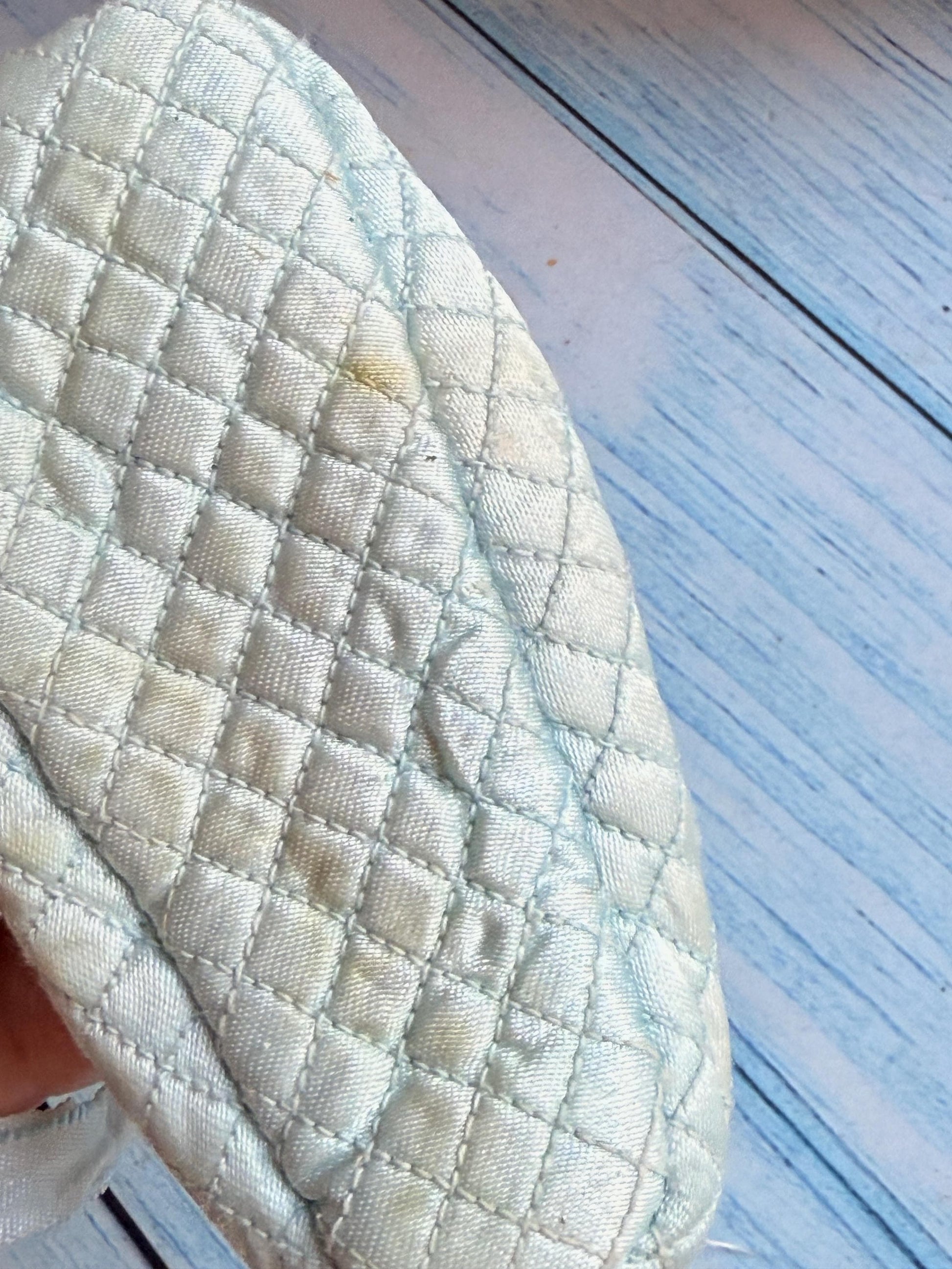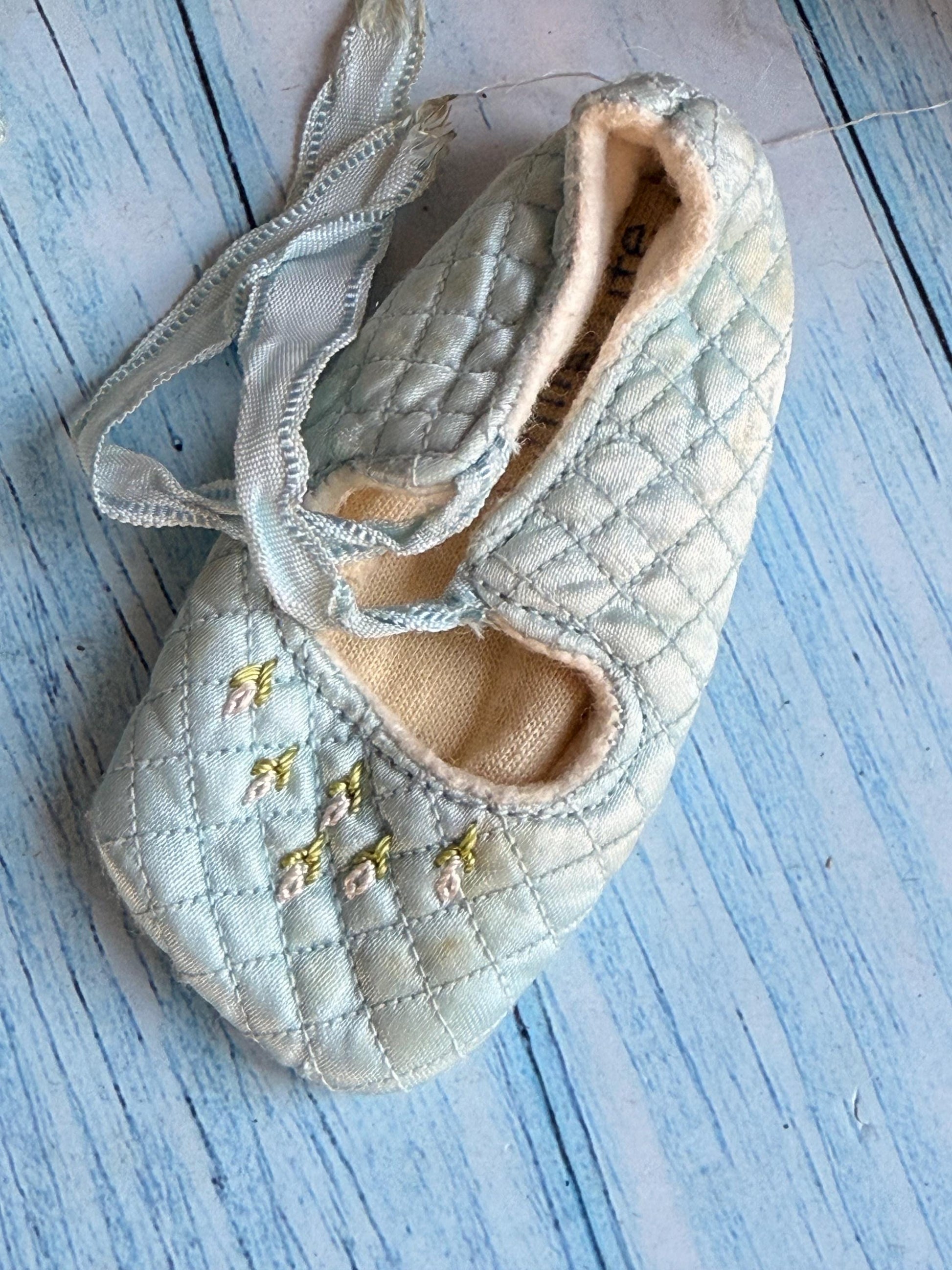 Just the sweetest pair of little pale blue baby slippers. Quilted rayon, lined with white knitted cotton. The slippers have rounded toes and self unit soles. They fasten at the ankles with ribbon and are decorated on the vamps with embroidery worked in coloured silks.