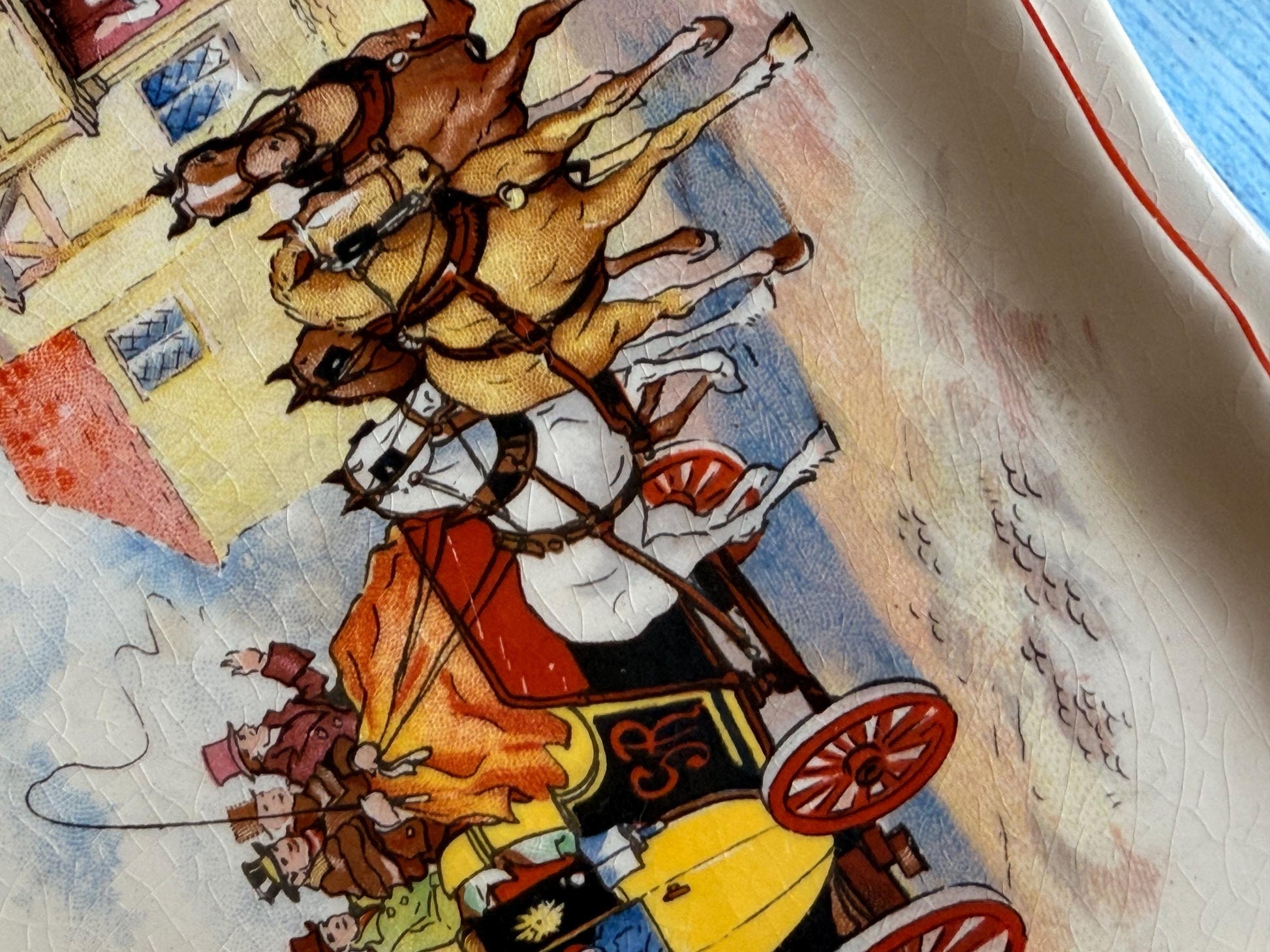 "Coaching Days" refers to a pattern of vintage tableware produced by Swinnertons, a Staffordshire pottery company, featuring scenes of horse-drawn carriages and coaching inns. The "Hampton Ivory" line describes the colour of the base ceramic for this and other Swinnertons patterns popular in the 1930s and 1940s