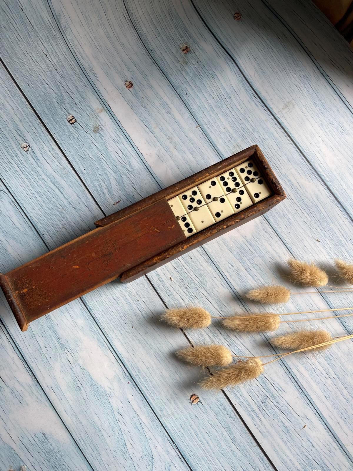 Condition: Dominoes are in excellent condition with no damage. The wooden box shows some wear consistent with age, and there is writing on the base – adding to its antique charm.