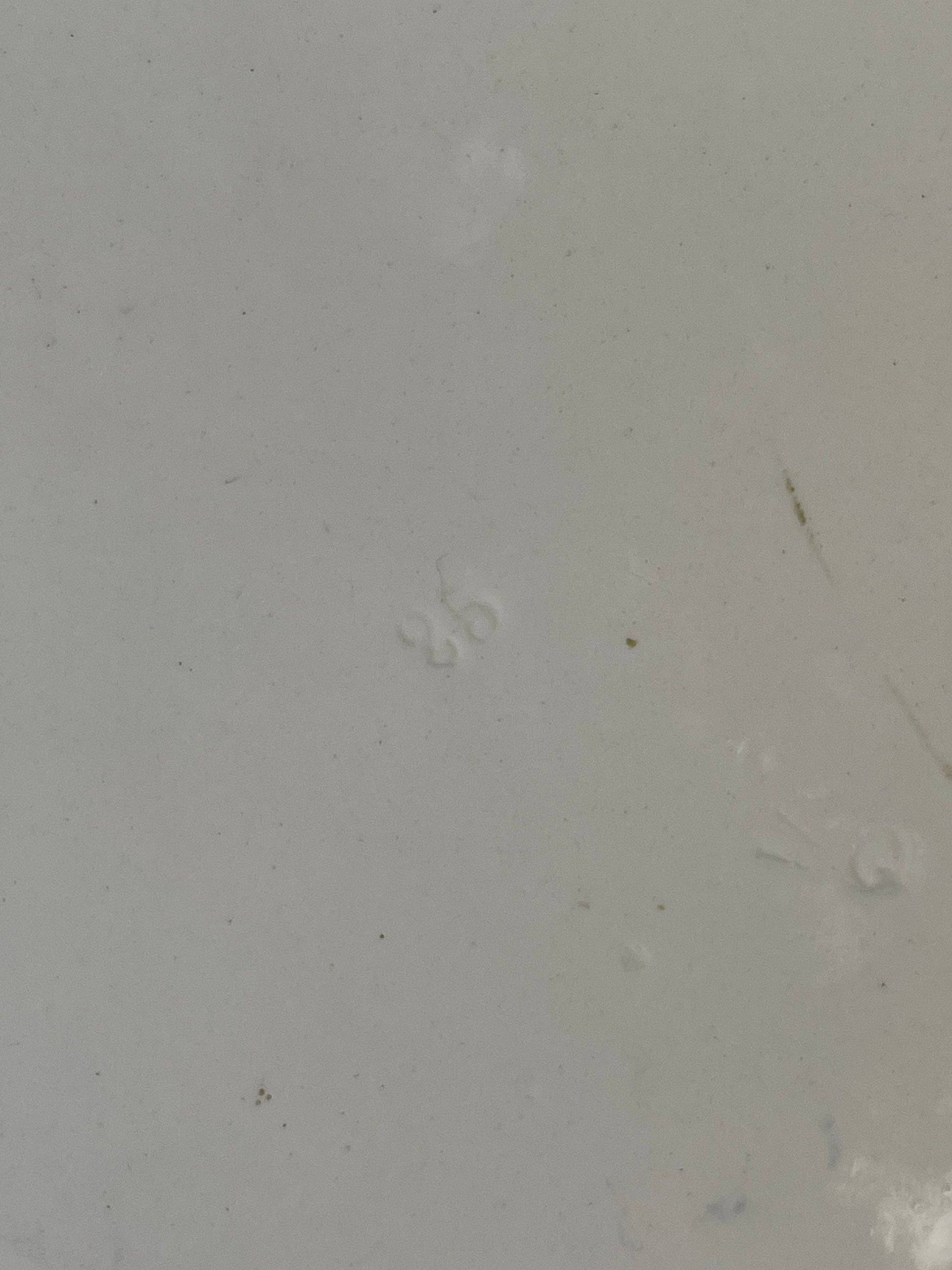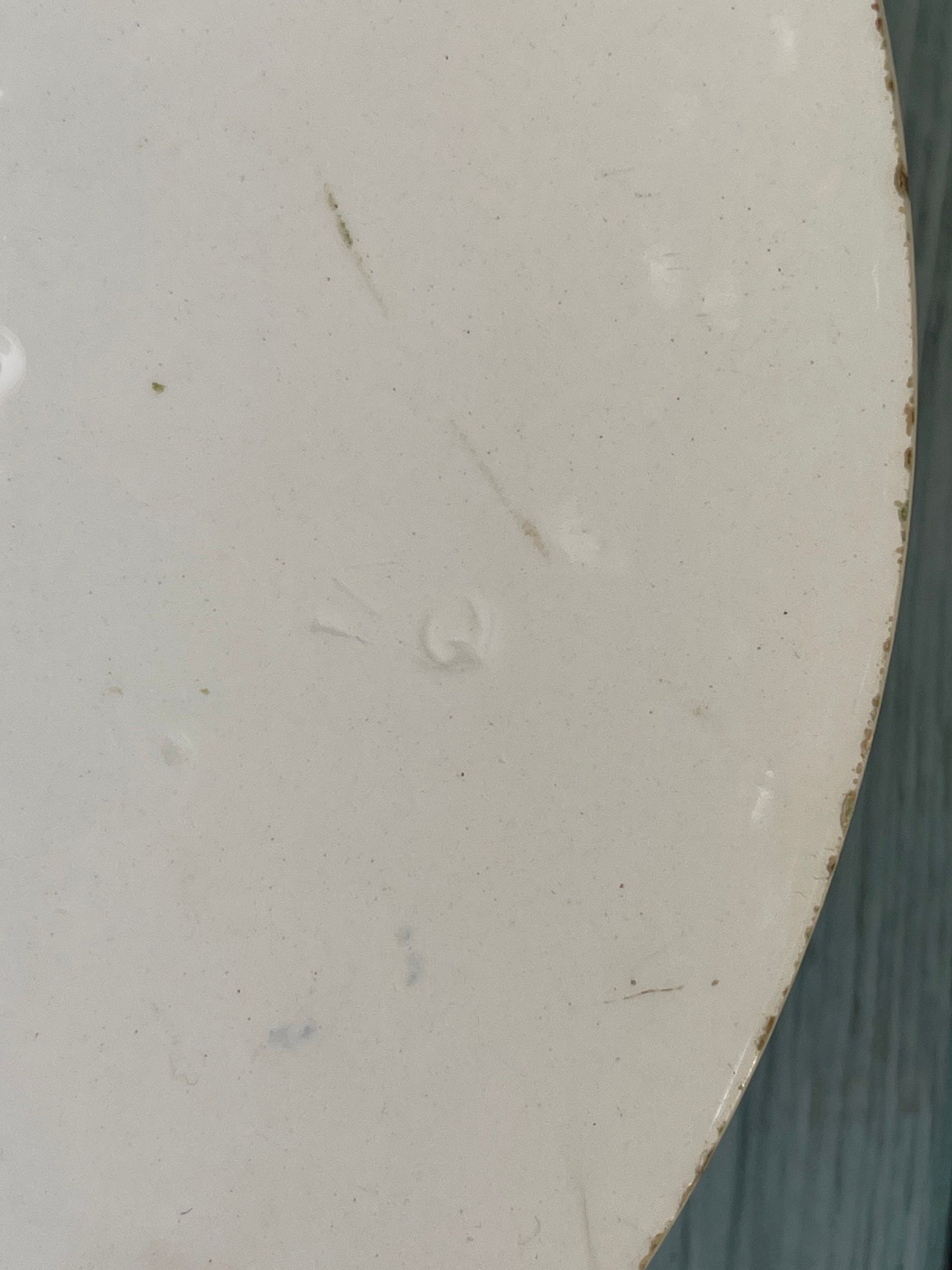 Has surface scratches and some nibbles to the glaze around the edge. No cracks