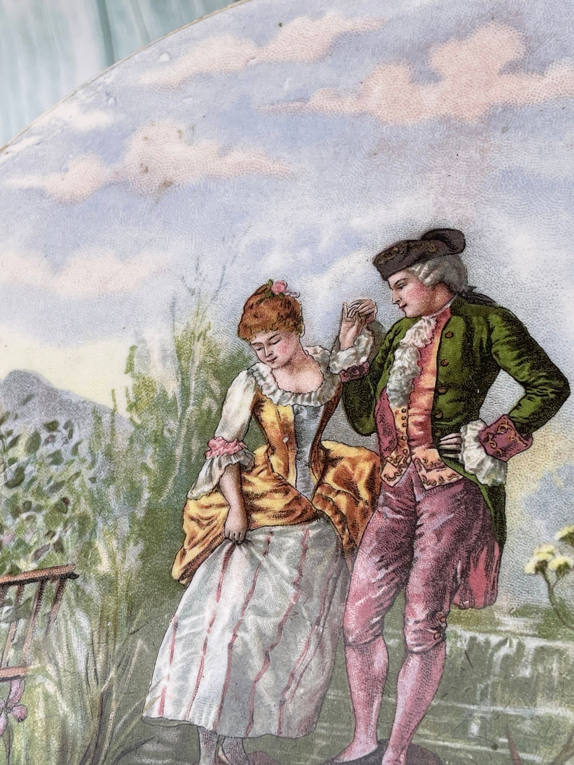 Victorian ironstone scale plate with charming scene of a couple crossing a stream on stepping stones