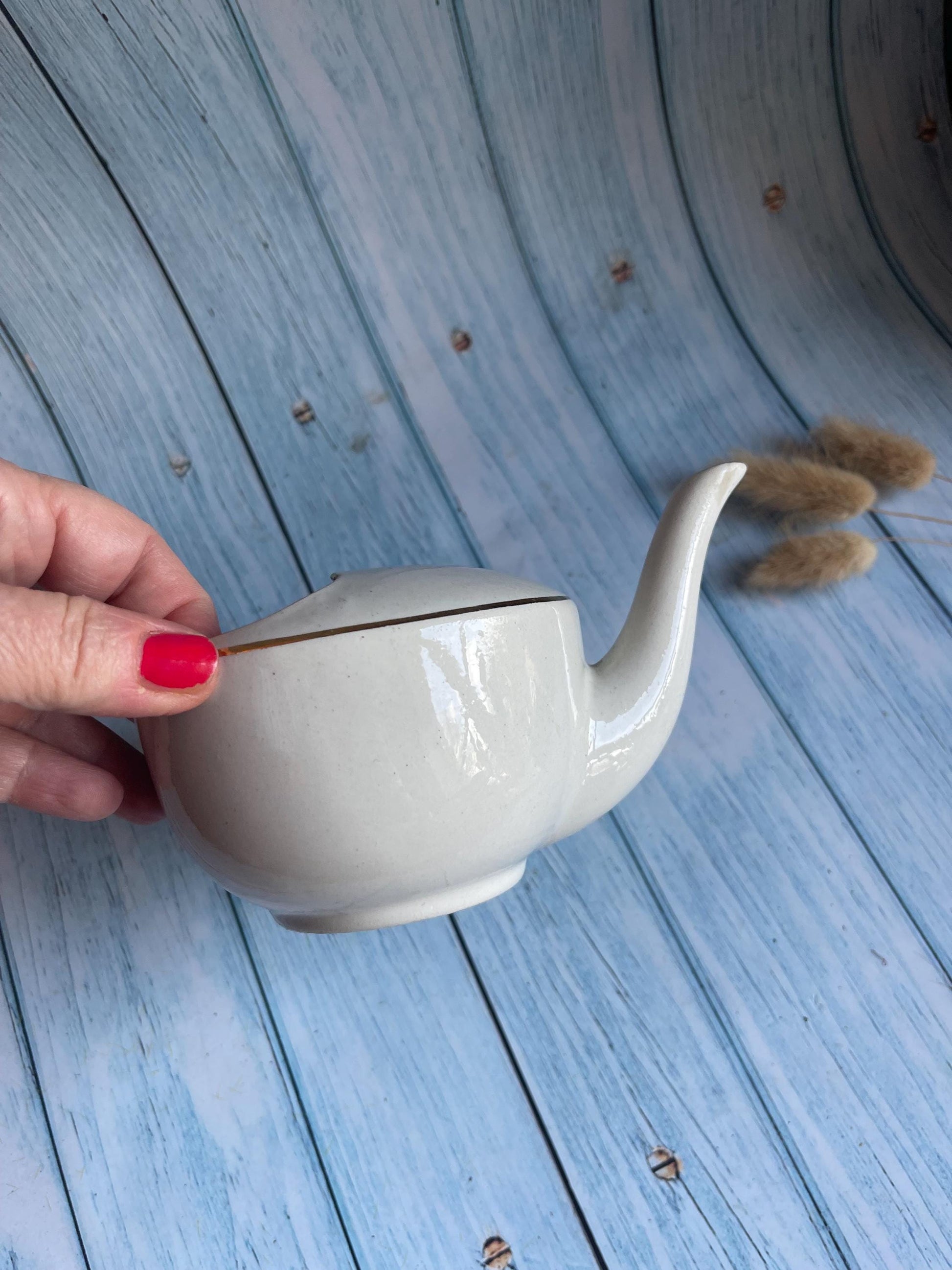 A rare and beautiful antique invalid feeder cup made by Maw & Sons, dating from 1914 to the 1930s. This collectible piece features the Maltese Red Cross stencilled on the top, with delicate gilt line accents adding a touch of elegance to its practical design.