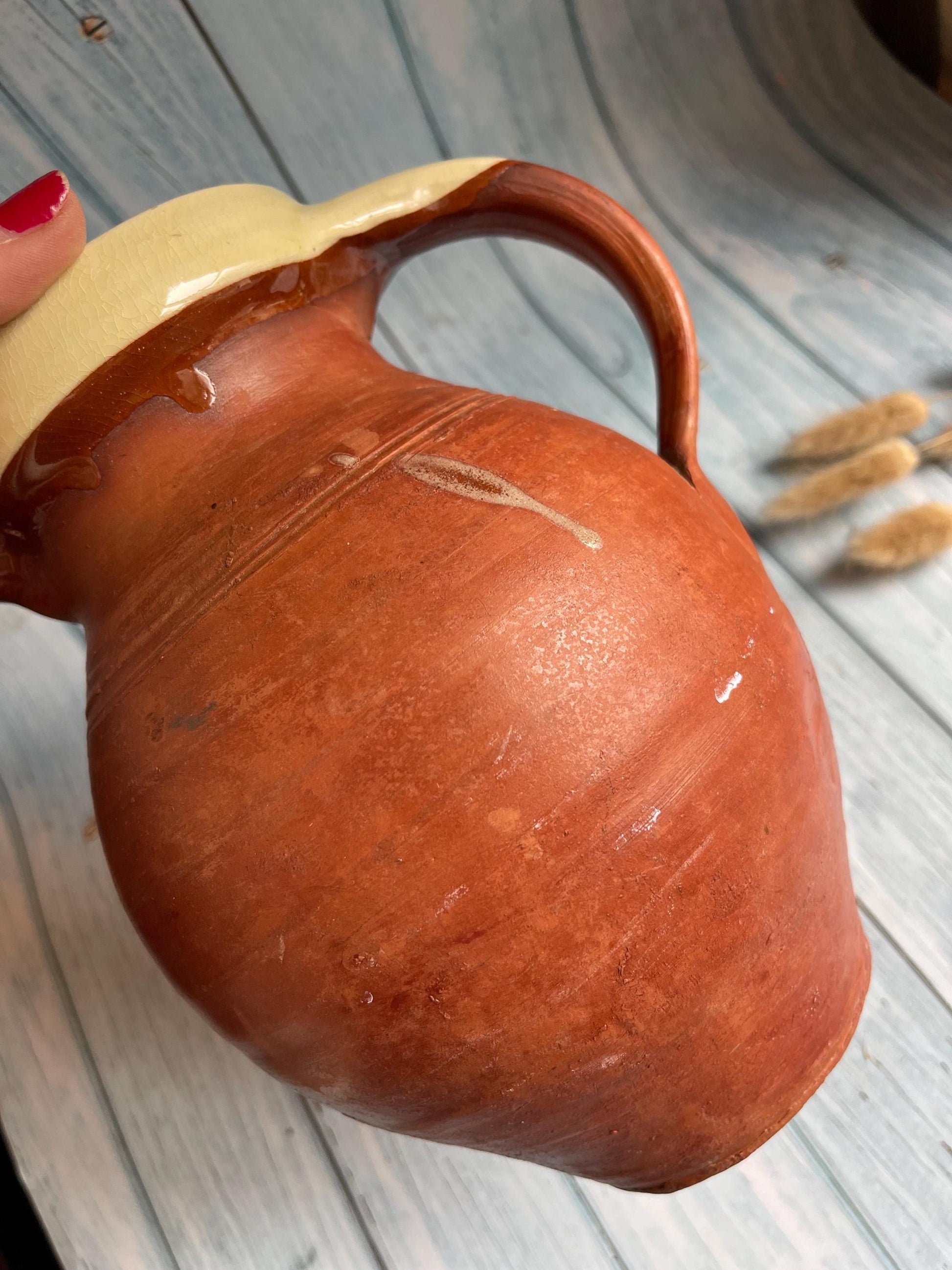 Antique Terracotta Jug | Handmade Rustic Pottery with Pale Yellow Slip Glaze