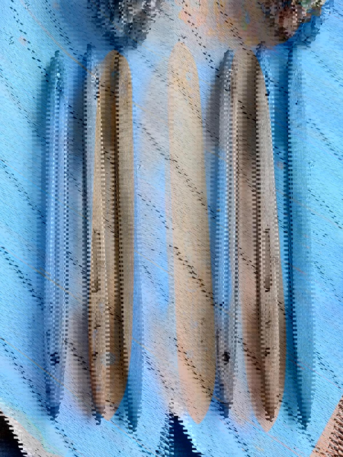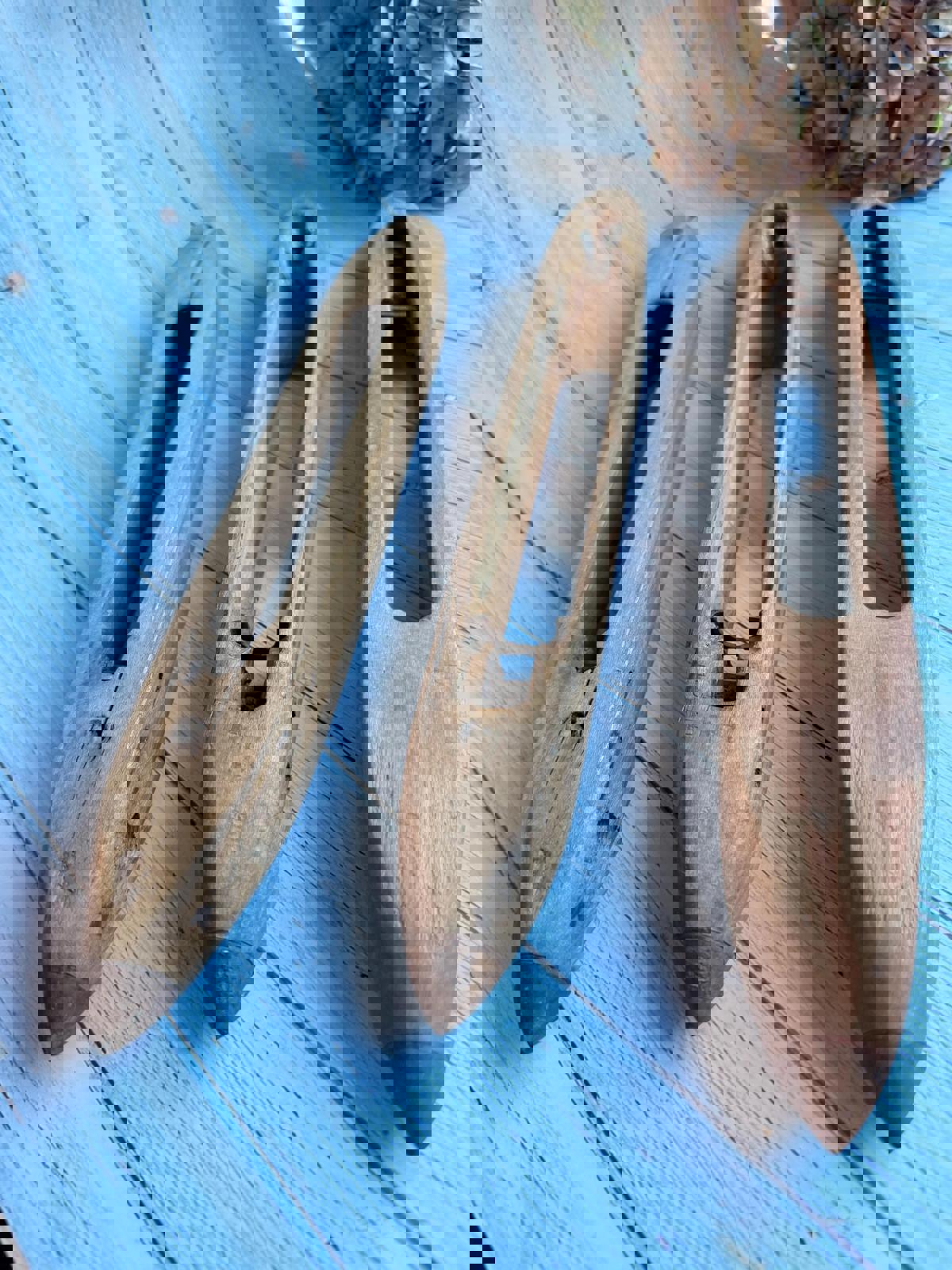 These antique French wooden loom shuttles are a beautiful piece of textile history, once used in traditional weaving mills. Crafted from solid wood with a smooth, timeworn patina, these shuttles make wonderful decorative pieces for a rustic or industrial-style interior.