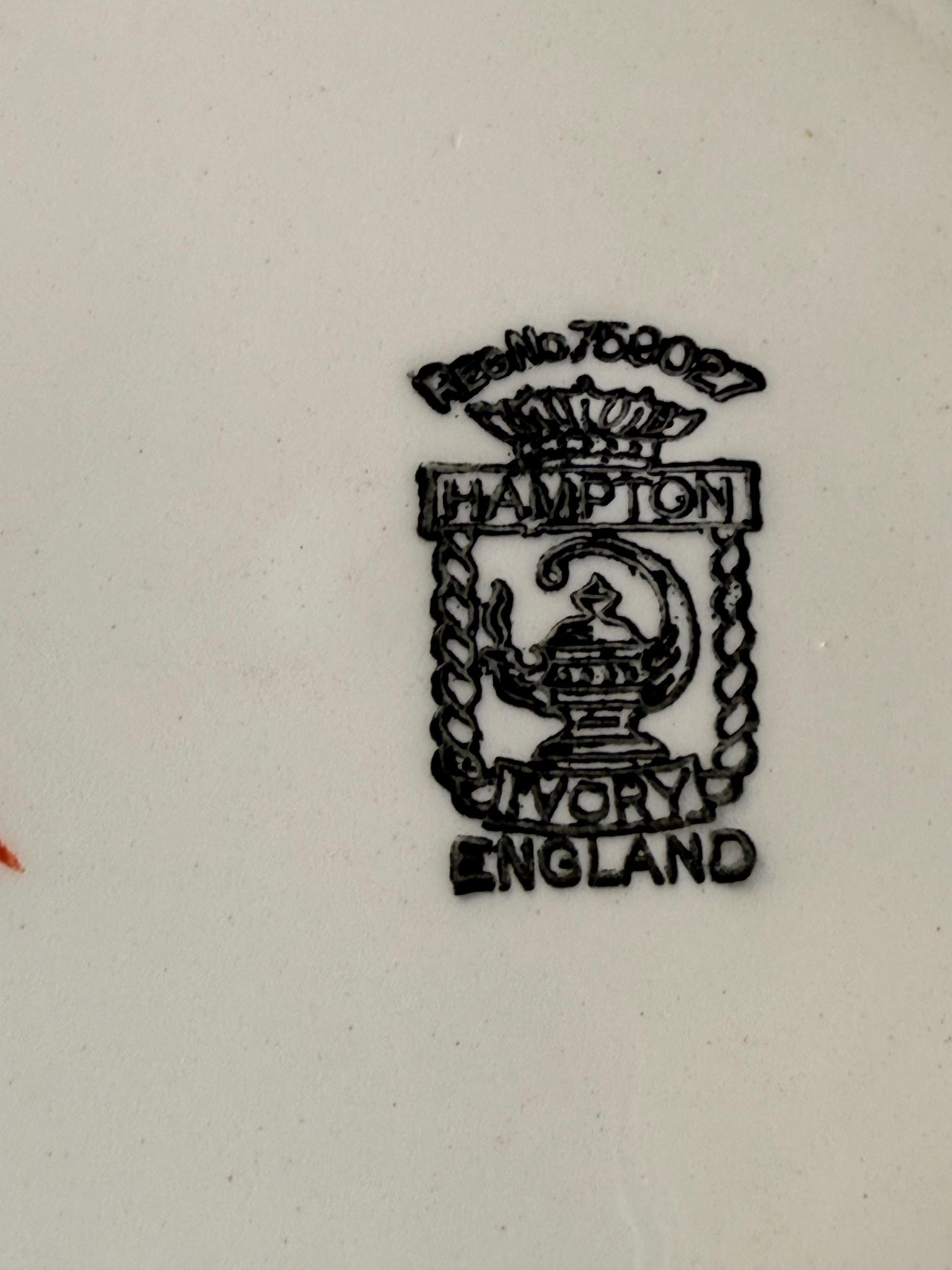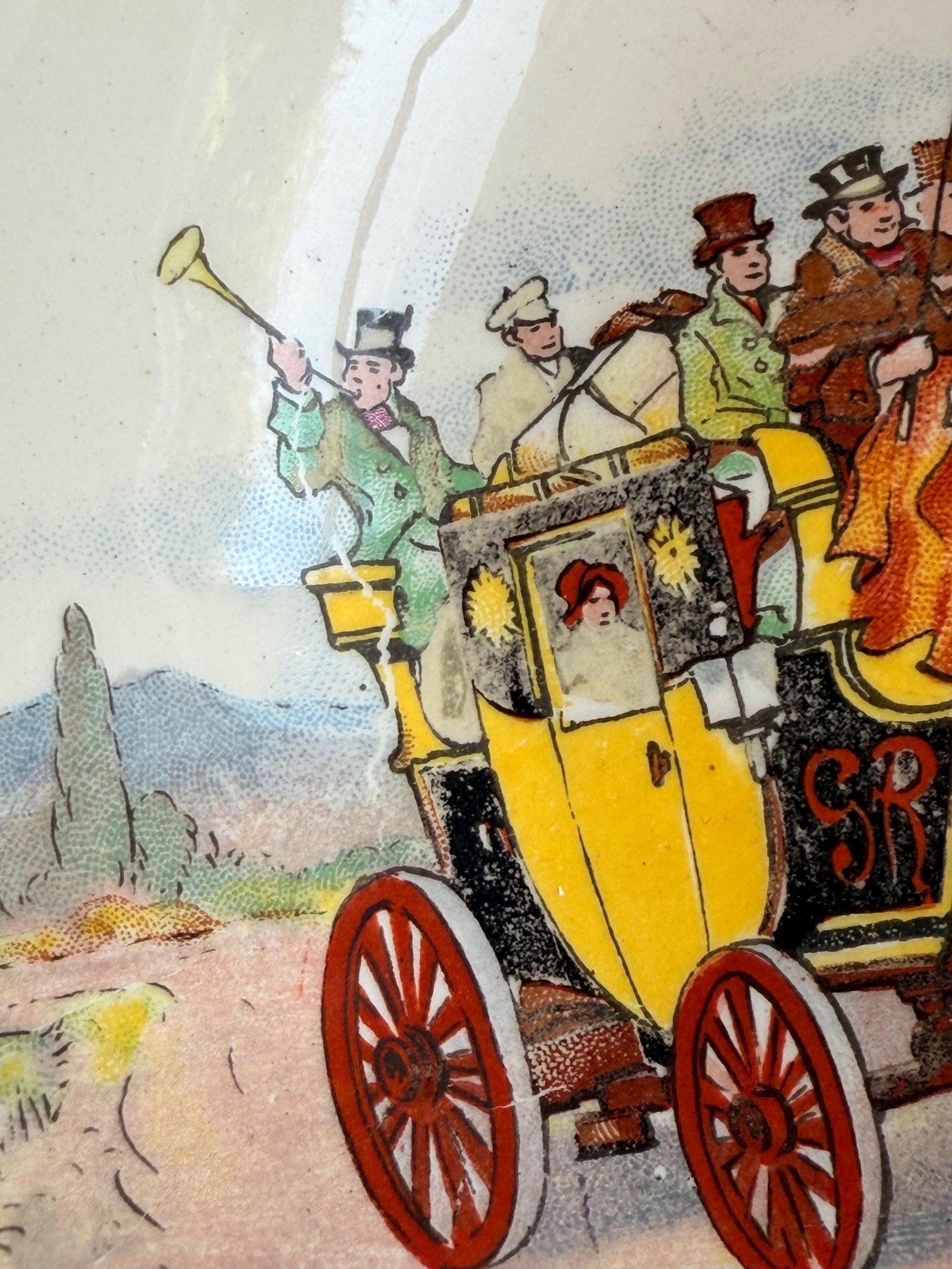 "Coaching Days" refers to a pattern of vintage tableware produced by Swinnertons, a Staffordshire pottery company, featuring scenes of horse-drawn carriages and coaching inns. The "Hampton Ivory" line describes the colour of the base ceramic for this and other Swinnertons patterns popular in the 1930s and 1940s