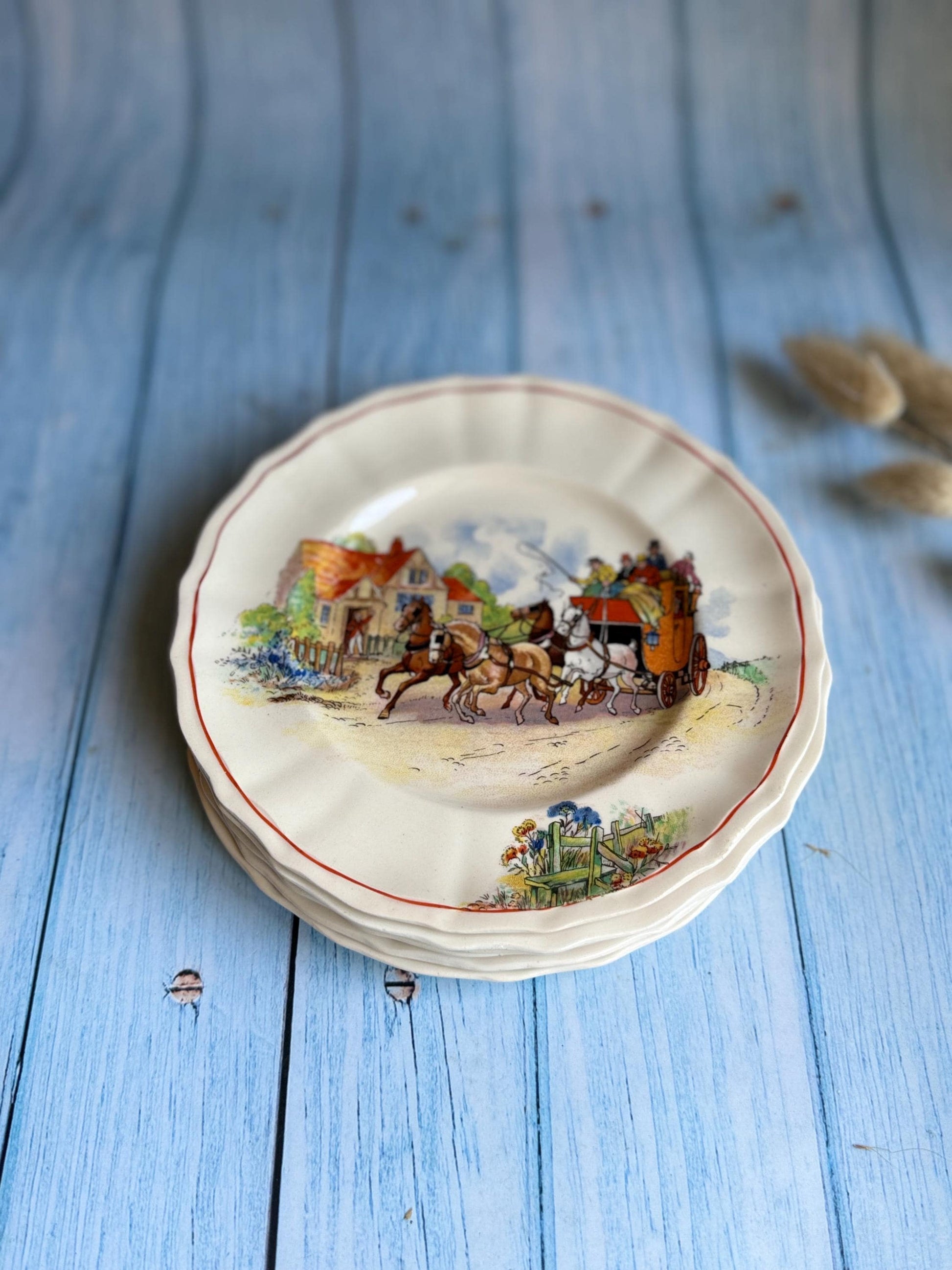 Swinnertons Coaching Days Set of Six Tea Plates: English Staffordshire Hampton Ivory, 1930