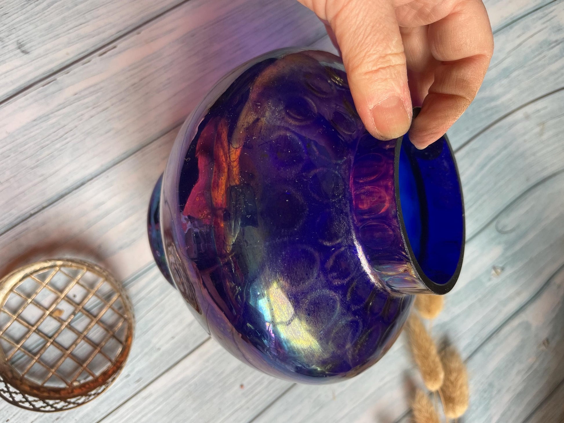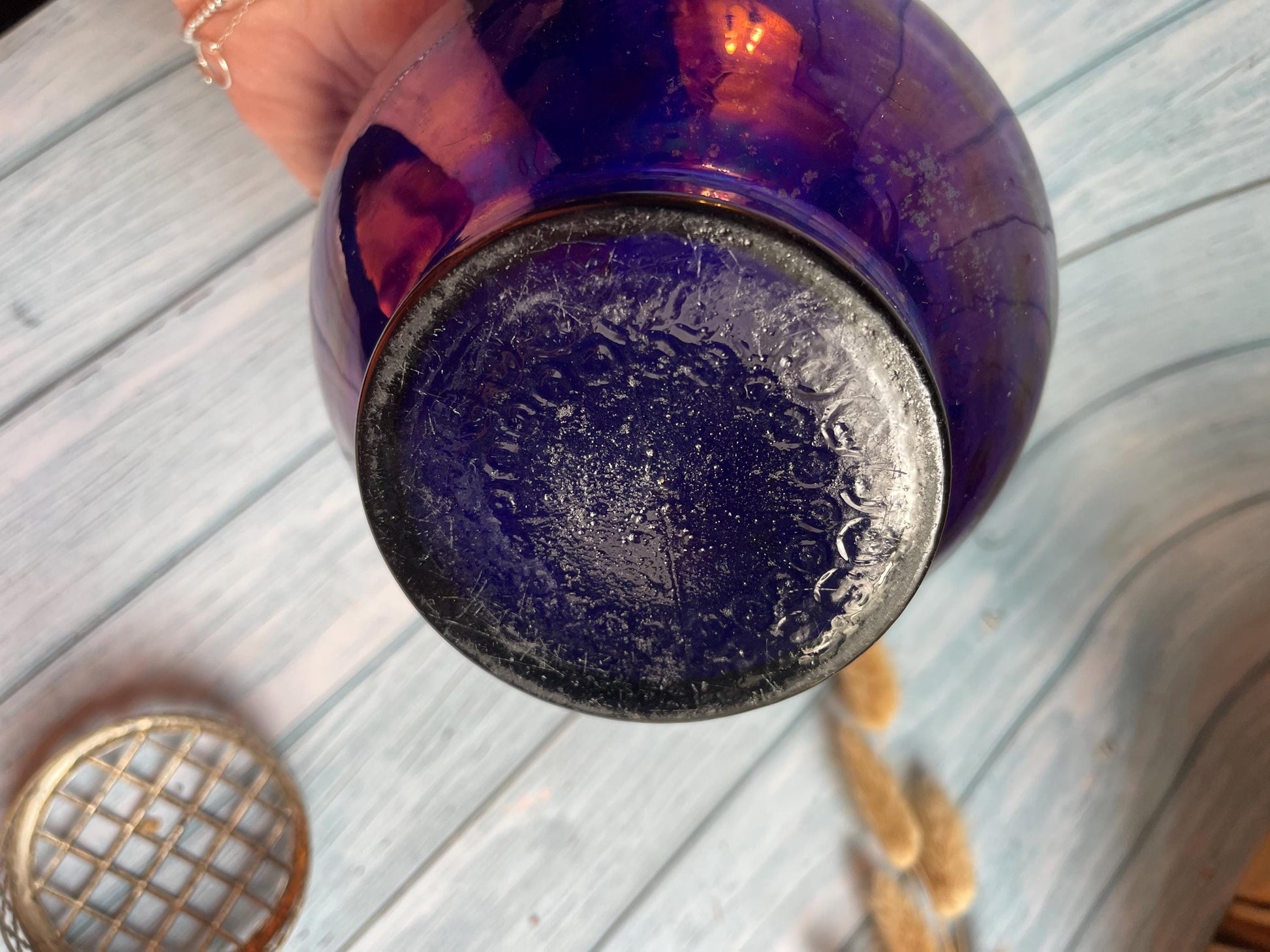 Beautiful blue / purple lustre vase, which shimmers with the colours of a peacock feather in the light, topped with a silver plated metal grill with ornate pierced detailing. The indent pattern of graduating ovals on the shoulder add to the peacock feather effect