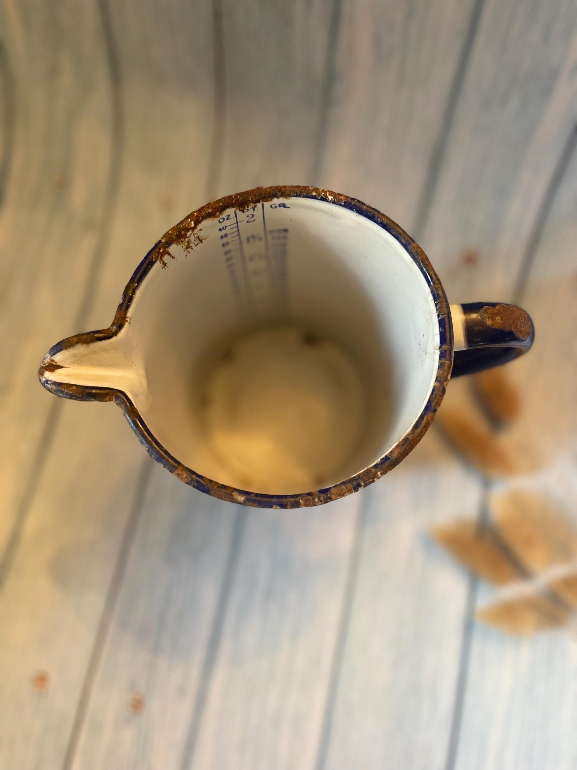 A gorgeous vintage English blue and white enamel measuring jug, featuring both imperial and metric measurements. This lovely rustic piece is full of charm, with chippy enamel, rust spots (particularly around the rim), and all the character you'd expect from an old kitchen essential.