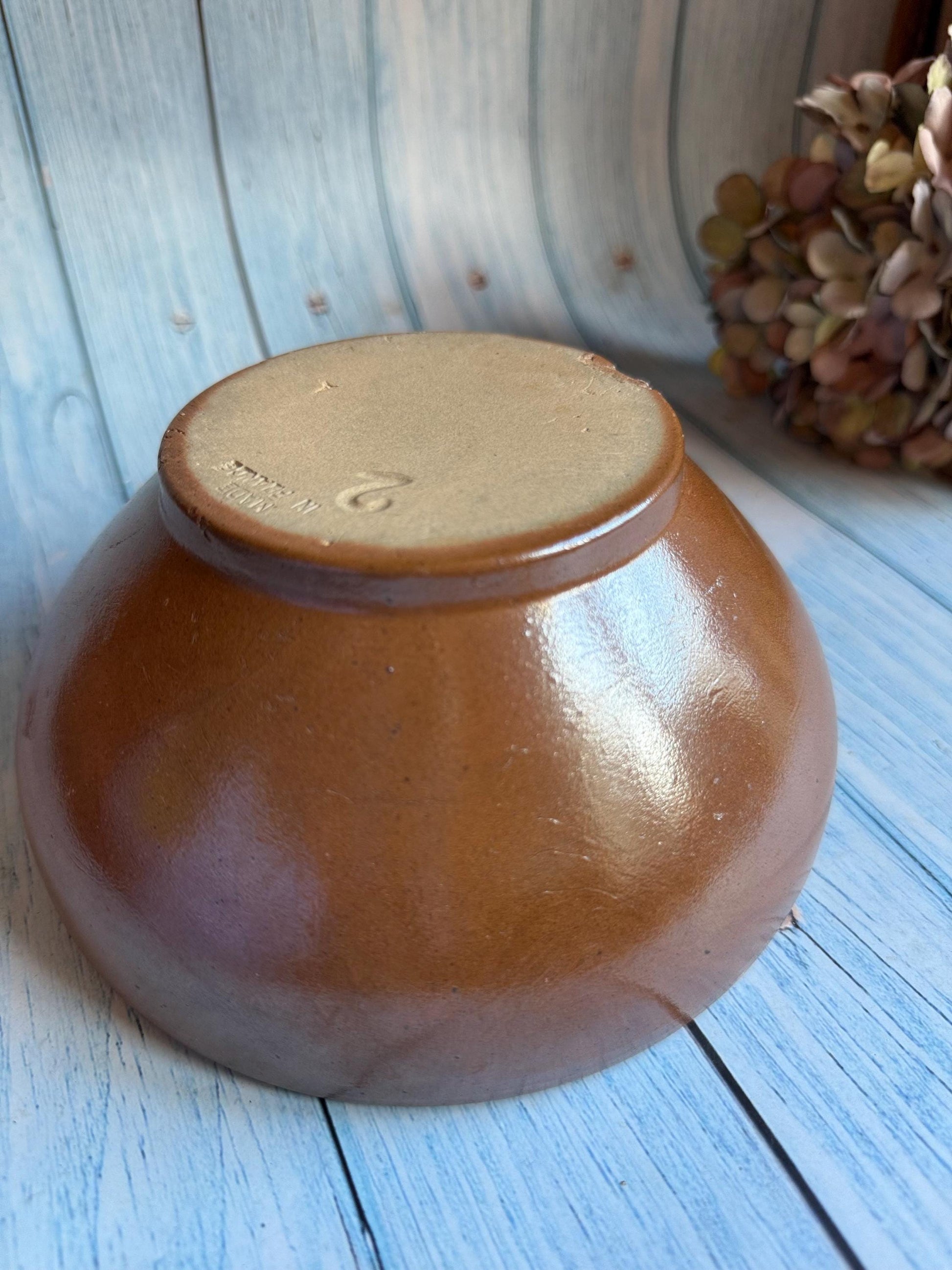 A lovely rustic French salt glazed stoneware bowl, perfect as a large soup bowl. Dark honey glaze to the exterior and clear glaze internally. Stamped '2' and Made in France on the base. It would make a nice bonbon dish or nut bowl. Super addition for the rustic French farmhouse look.