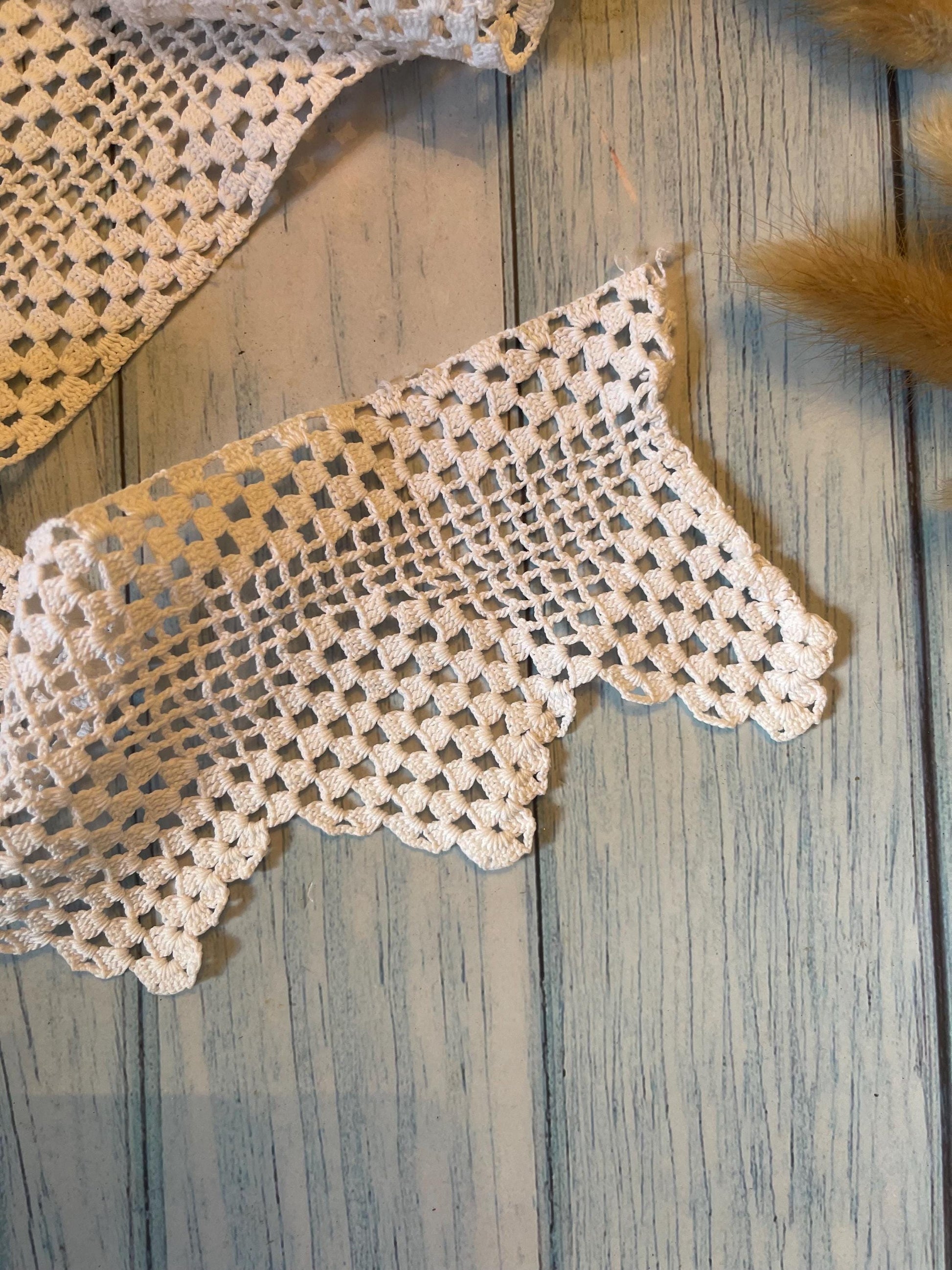 A beautiful length of vintage French handmade crochet lace trim in classic white. This delicate piece is expertly crafted with a lovely pattern, perfect for a variety of creative projects.