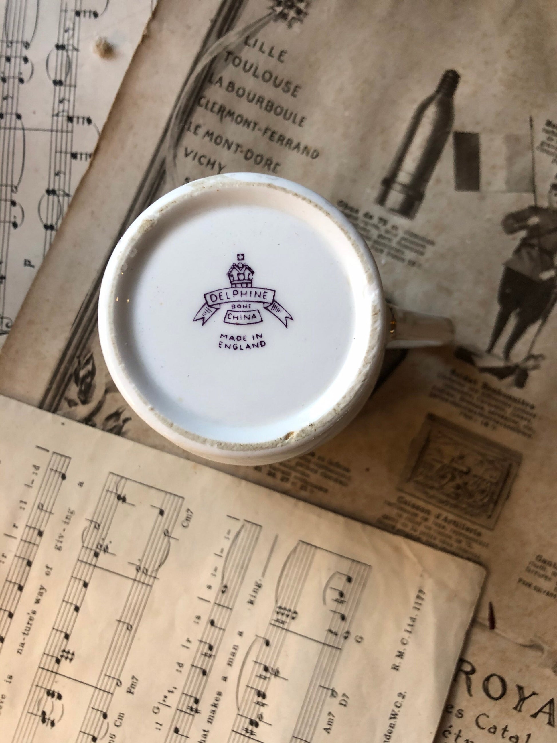 Transfer printed design on both sides (same design but smaller on one side) with makers mark to base