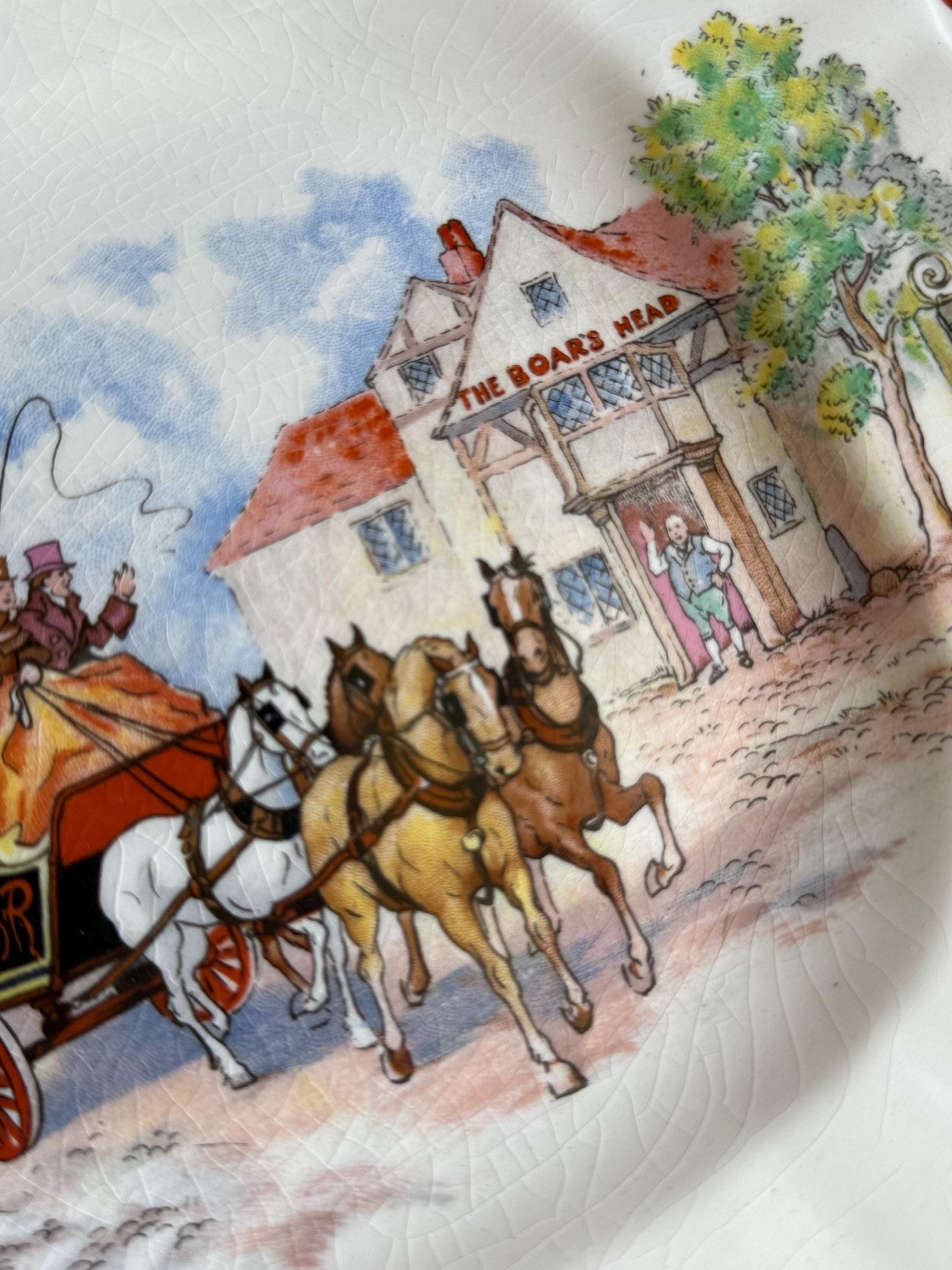 "Coaching Days" refers to a pattern of vintage tableware produced by Swinnertons, a Staffordshire pottery company, featuring scenes of horse-drawn carriages and coaching inns. The "Hampton Ivory" line describes the colour of the base ceramic for this and other Swinnertons patterns popular in the 1930s and 1940s
